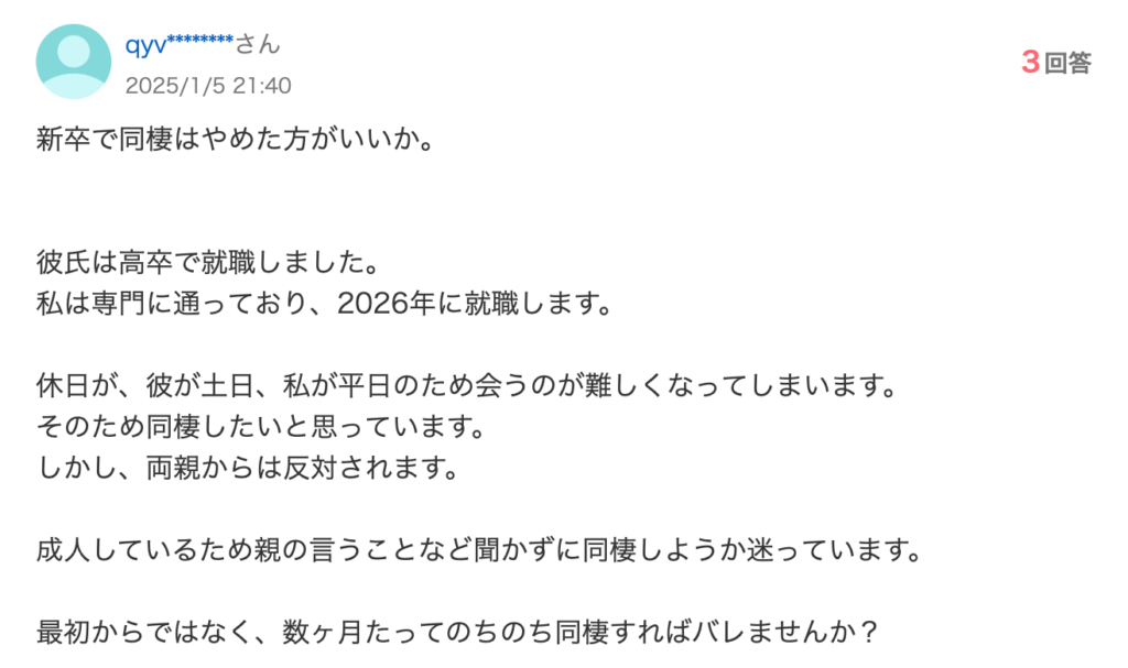 といった悩みを抱えている人も多いのではないでしょうか。Yahoo!知恵袋でも、新卒の同棲について悩んでいる人もいます。(参照元:Yahoo!知恵袋)