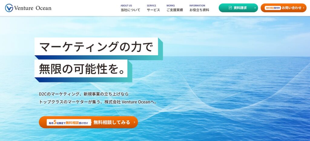 株式会社Venture Oceanは、新規事業やD2Cに特化したマーケティングコンサル会社です。株式会社Venture Oceanでは新規事業立ち上げコンサルティングD2Cコンサルティング商品開発コンサルティングなどのサービスを行われています。代表は1年で70億のブランドを立ち上げた経験があり、新規事業のプロが集っております。マーケティングでお悩みの方はぜひ一度、ご相談ください。